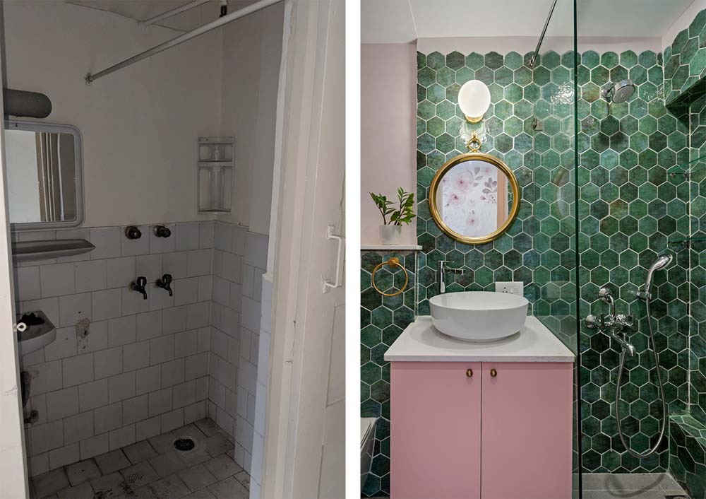 A unique set of honeycomb-shaped jade tiles immediately livens up the room with it’s jewel-toned allure. The gilded mirror, light fixture and towel ring add to the glam factor of the space. To add a pop of colour, the fronts of the cabinets below the sink have been painted baby pink. It’s hard to believe this was once a cramp and dank bathroom interior design.