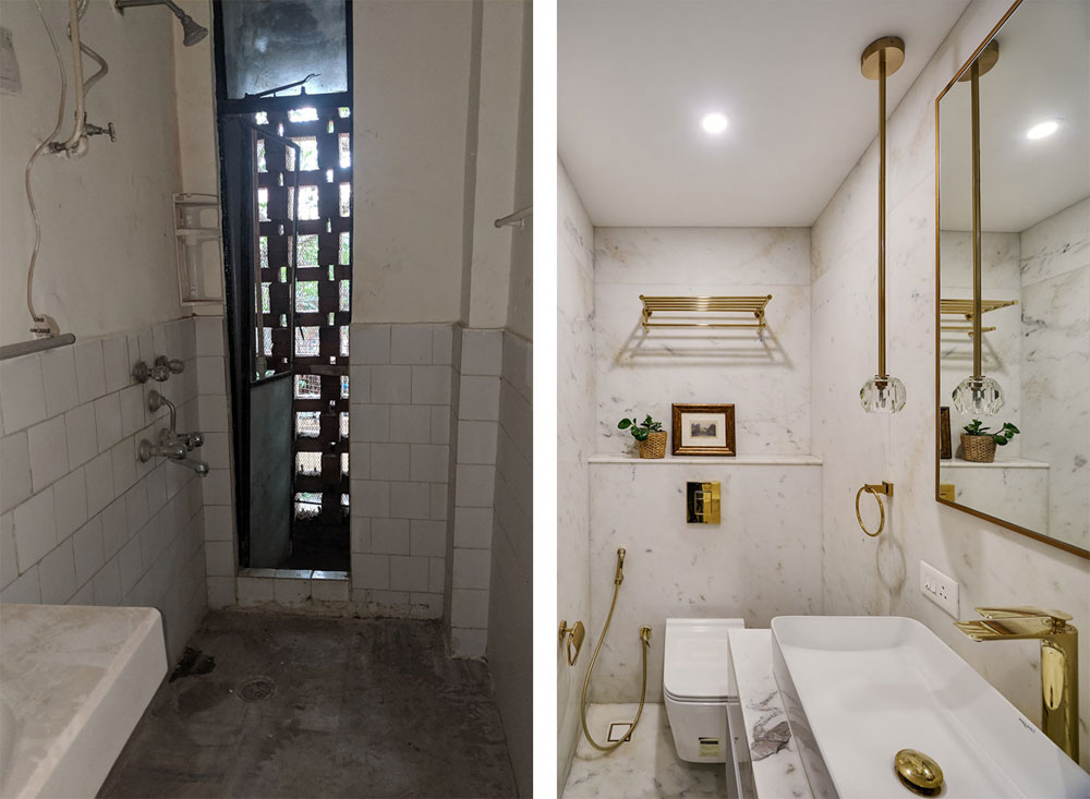When renovating any room in the house, and trying to work within a budget, always take stock of what you can reuse or restore first. Not only will it save you the cost of buying something new, it’s also a wiser and more sustainable way of living in modern times. In this bathroom renovation for a home, the toilet pot, flush switch and sink have been given a generous scrub and retained, along with the original window frame. While a set of patterned cement tiles revamp the area around the toilet, the marble countertop has been built around the sink to conceal it under. For added storage, a set of open shelves below bring in added solutions for storage. Since this bathroom interior design is narrow in depth, the tap fitting on the countertop has been fitted on the side to avoid having a deeper console.