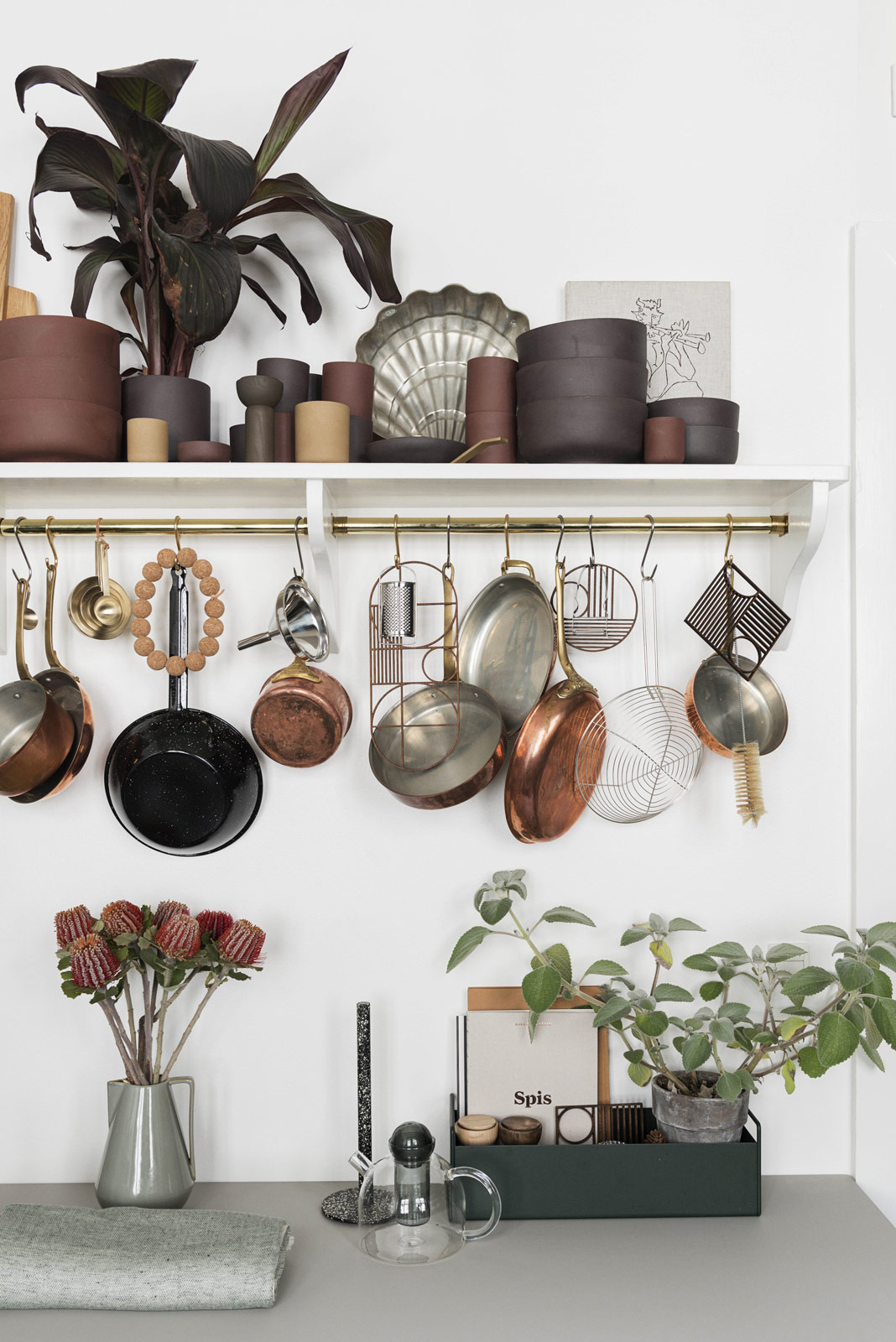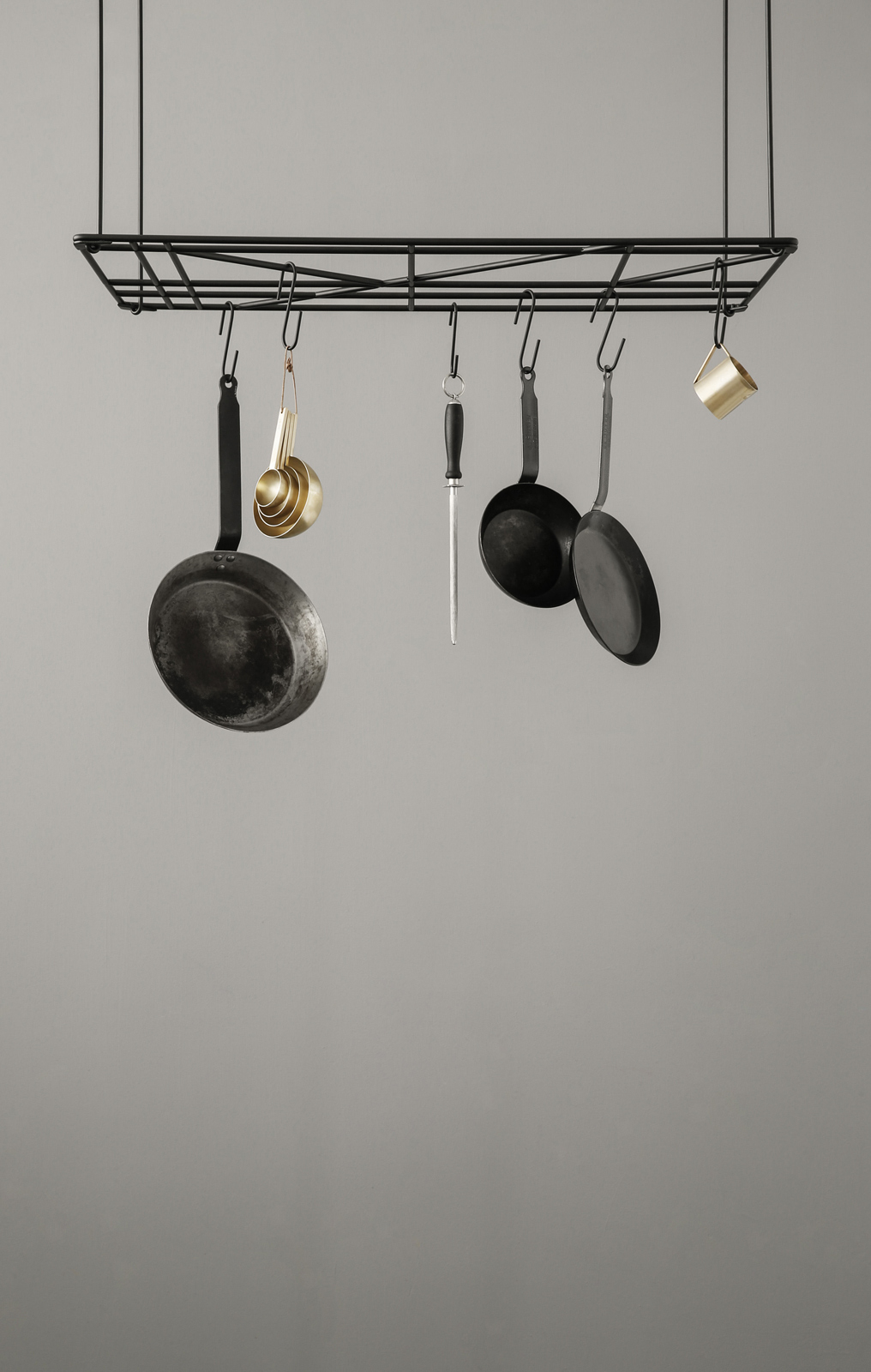 Storing your pots and pans has never been easier. Suspending a pot rack over head with several hooks and rods to hang up your utensils is a clever idea. This means no more awkward bending or overstretching to reach that skillet.