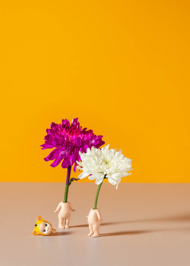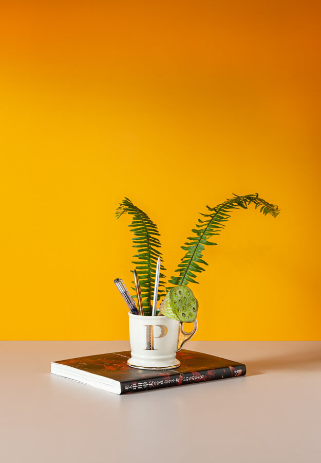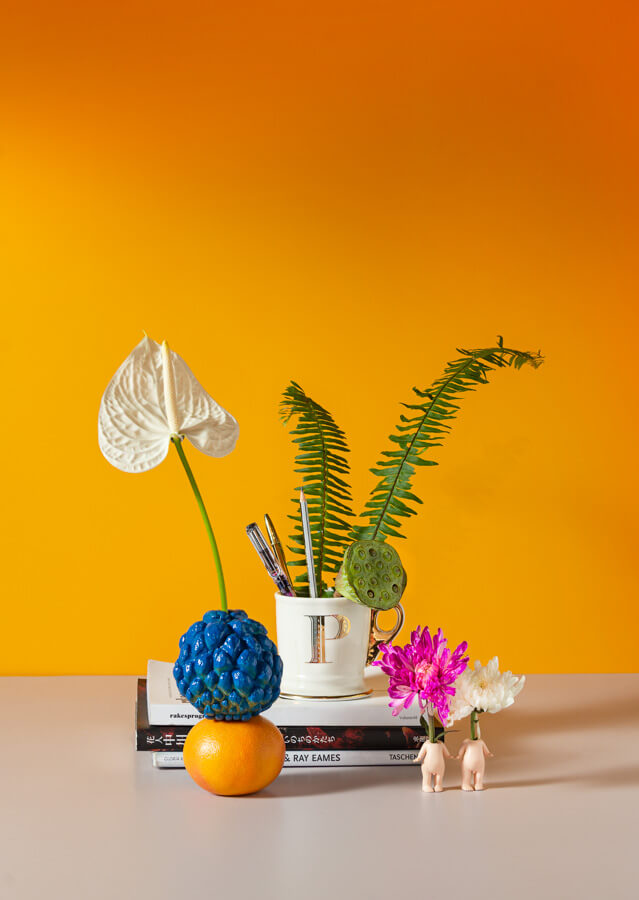 The desk accessories can double up as vases in this foraged design. A pen stand, a glass, a jig, or a coffee mug maybe? Or, repurpose old toys and collectibles into a holder for a flower or a leaf.