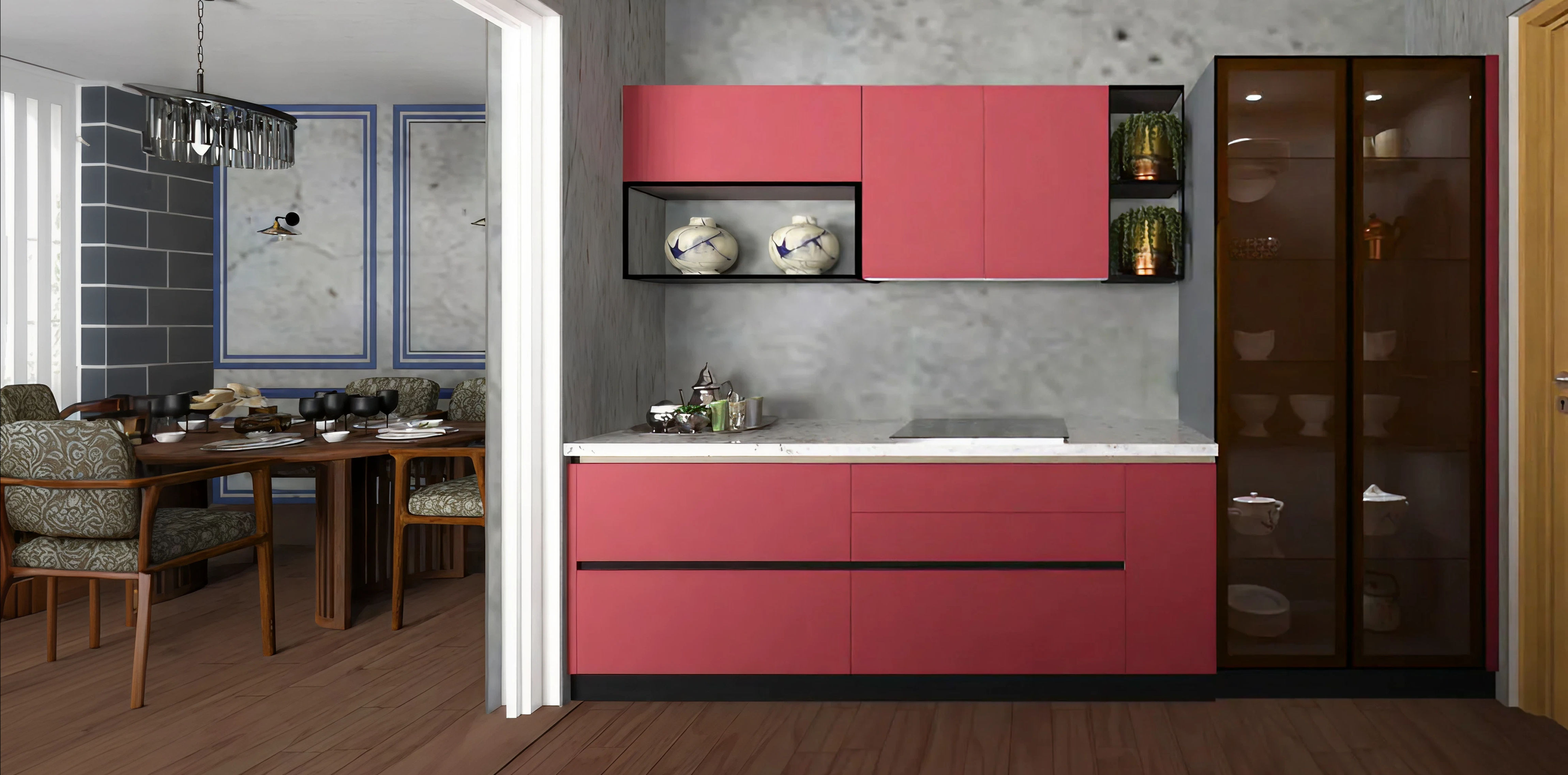 The Modern Parallel Kitchen suits modern homes that need a practical yet refined cooking space. With its clean lines and laminate in hgl solid toned blue (22212), the layout makes effective use of the corner while keeping counters open for preparation. Integrated storage and well-defined work zones help maintain an easy cooking flow.